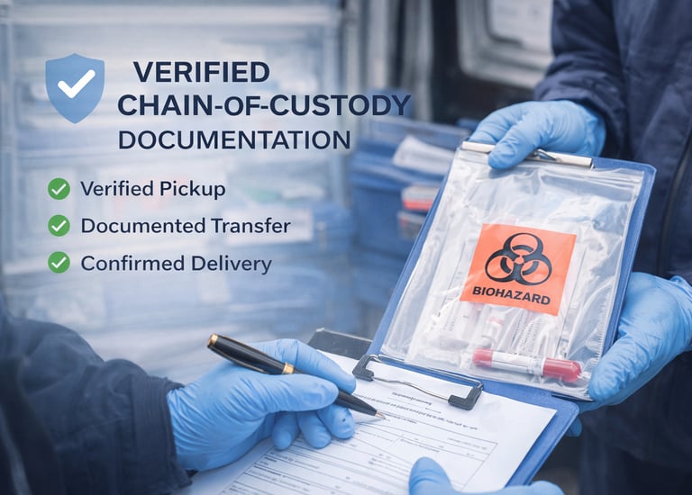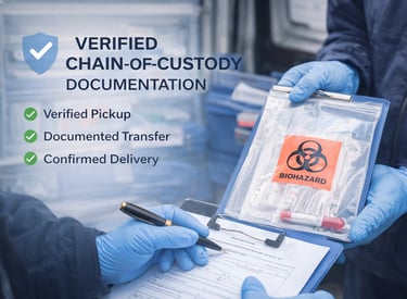 Reliable recurring pickups designed for laboratories, clinics, and outpatient facilities. We maintain strict chain-of-custody procedures and follow temperature-control protocols when required.